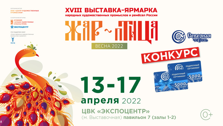 C 13 по 17 апреля 2022 г. в ЦВК "Экспоцентр" состоится долгожданная XVIII выставка-ярмарка народных художественных промыслов и ремесел «Жар-птица. Весна 2022». И для одного из посетителей мы приготовили уникальный приз – подарочный сертификат номиналом 10.000 рублей на покупку изделий Великоустюгского завода «Северная чернь».