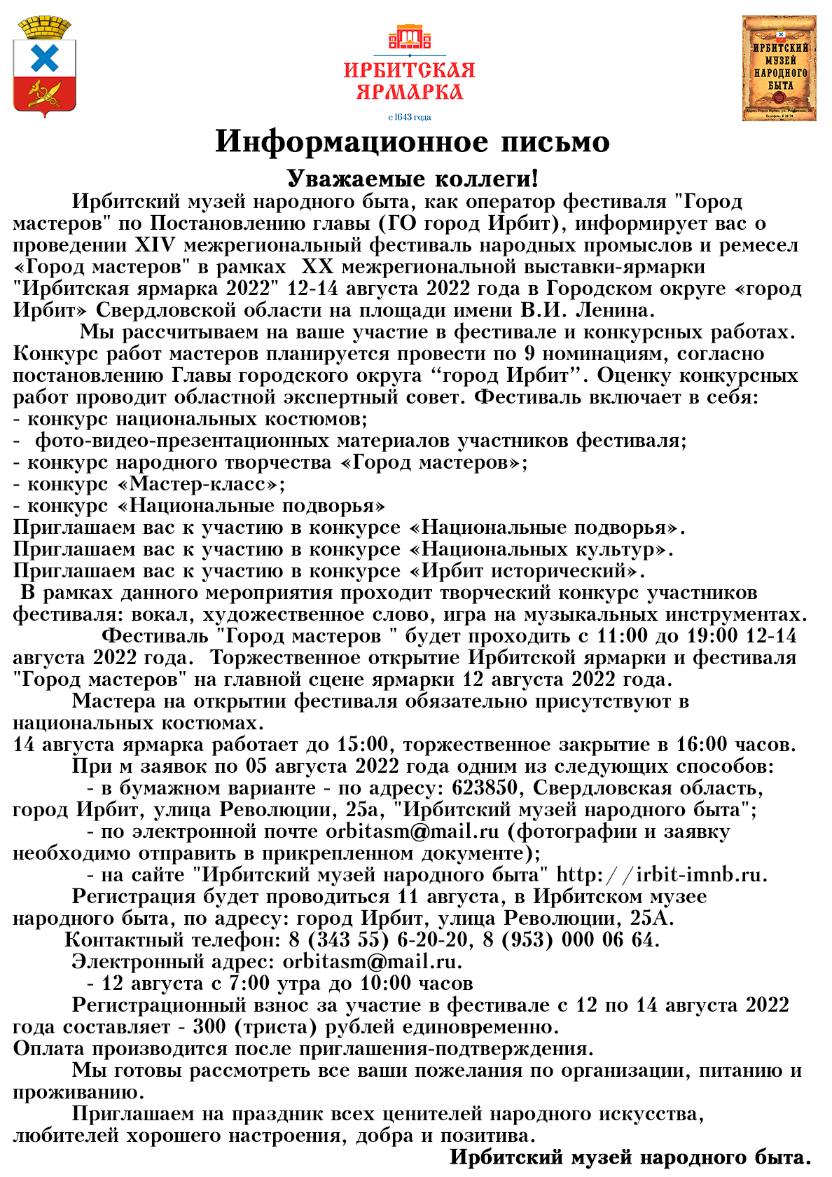 Заявка на участие в XIV межрегиональном фестивале народных промыслов и ремесел «Город мастеров» г. Ирбит, 12-14 августа 2022 г.