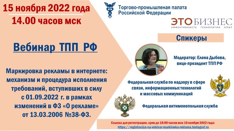 Торгово-промышленная палата Российской Федерации проводит 15 ноября 2022 года (начало в 14:00 часов мск) специальный вебинар, в ходе которого представители Роскомнадзора и ФАС России ответят на вопросы по механизму и процедуре исполнения требований, вступивших в силу с 01 сентября 2022 года в рамках изменений в ФЗ «О рекламе» от 13 марта 2006 года No 38-ФЗ, о необходимости маркировки рекламы в интернете.