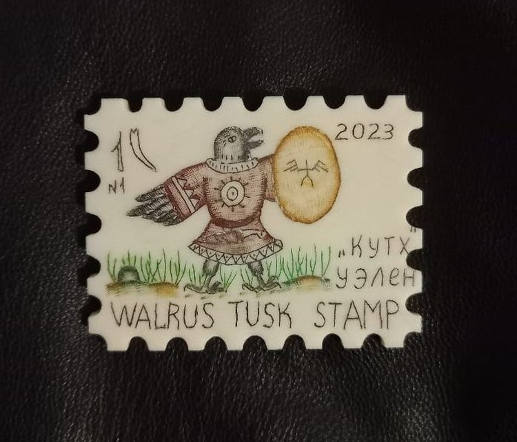 Марка-виньетка из бивня моржа (WALRUS TUSK STAMP) разработана и выполнена в производственном цеху «Уэленская косторезная мастерская» с участием мастеров-косторезов. На необычной марке из бивня моржа изображен популярный герой в преданиях народов Чукотки и воплощение духа Ворона - КУТХ., а также надпись на английском языке WALRUS TUSK STAMP, что означает марка из бивня моржа. Марка с гравировкой имеет толщину - 2 мм., размер - 40 x 50 мм., имеет свой персональный номер начиная от №1 и т.д. и уникальный номинал – 1 бивень моржа и год выпуска - 2023.