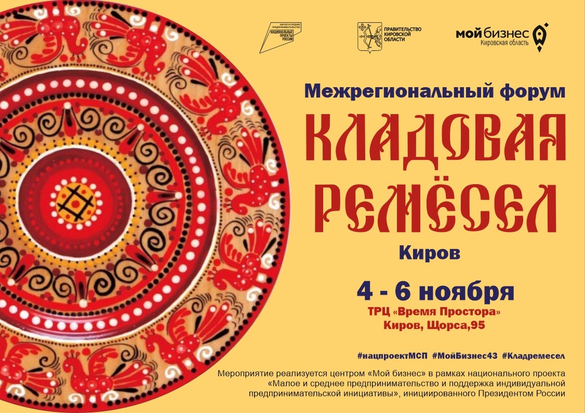 4 - 6 ноября 2023 г. в Кирове состоится межрегиональный форум народных художественных промыслов «Мой бизнес. Кладовая ремесел. Киров». Мероприятие реализуется центром «Мой бизнес» в рамках национального проекта «Малое и среднее предпринимательство и поддержка индивидуальной предпринимательской инициативы», инициированного Президентом России.