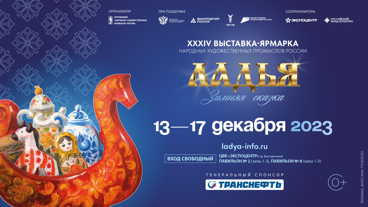 В целях поддержки отечественных производителей, совершенствования художественного уровня и мастерства, повышения квалификации специалистов отрасли, популяризации народного искусства Ассоциацией «Народные художественные промыслы России» с 13 по 17 декабря 2023 года в ЦВК «Экспоцентр» проводится выставка-ярмарка народных художественных промыслов «ЛАДЬЯ. Зимняя сказка-2023», крупнейшая в стране по данной тематике.