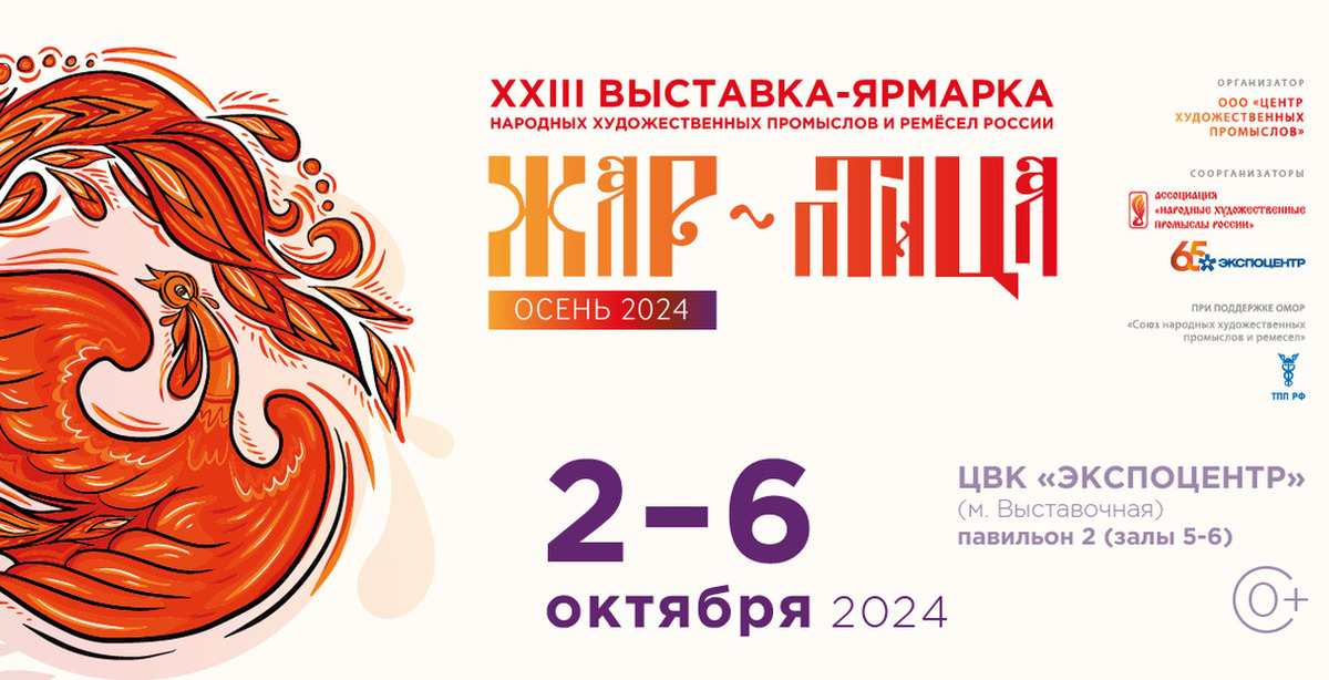 В целях популяризации народного искусства, сохранения культурных традиций, этнокультурного многообразия, культурной самобытности всех народов и этнических общностей со 2 по 6 октября 2024 года в ЦВК «ЭКСПОЦЕНТР» пройдет XXIII выставка-ярмарка народных художественных промыслов и ремёсел России «ЖАР-ПТИЦА. ОСЕНЬ 2024».