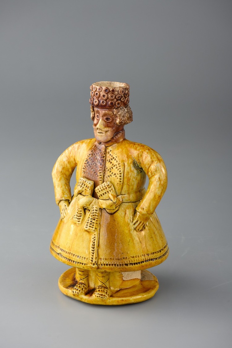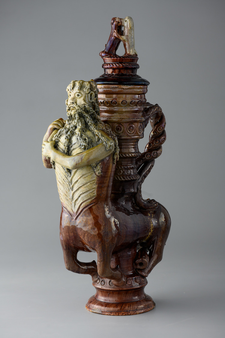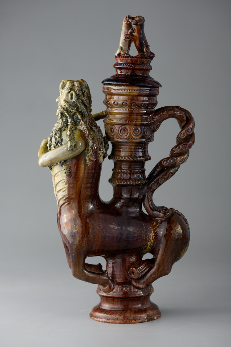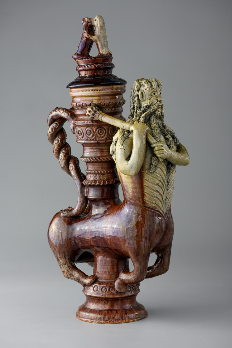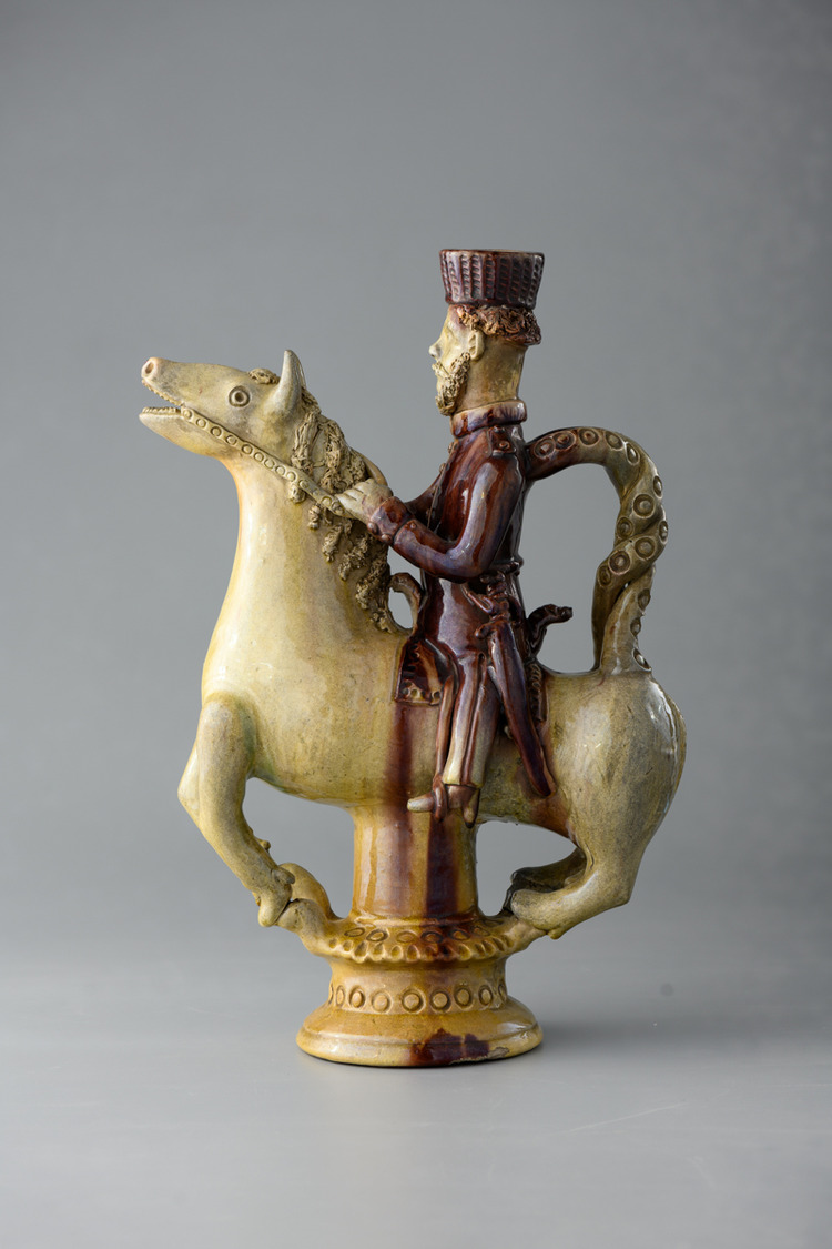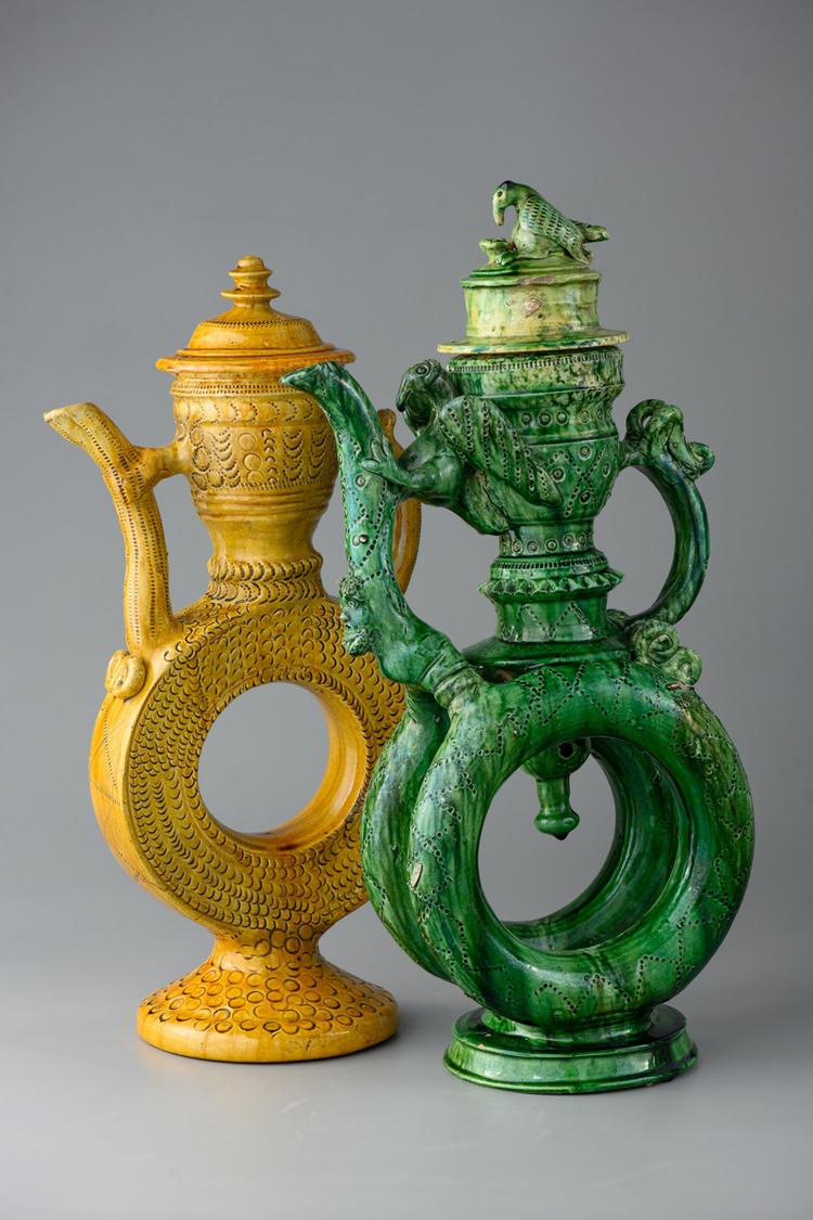 Декоративные фигурные сосуды скопинских гончаров — яркий пример того, как народный мастер воспринимает и объединяет мир реальный и мир фантазийный. Керамисты Скопина черпали свое вдохновение из народных сказаний и фольклора, переносили любимые образы в пластические формы кувшинов, подсвечников и скульптур, где сказочные персонажи — Полкан, Дракон, Сирин — соседствуют с животными и людьми. В ряде случаев один сосуд объединяет несколько персонажей, и такие произведения можно прочитать как сказочное или поэтическое повествование, близкое литературному жанру.