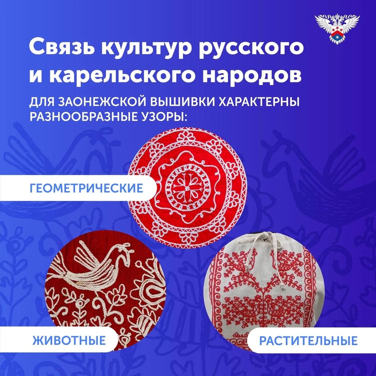 Заонежская вышивка – древний народный художественный промысел, традиции которого восходят к ХIII–ХIV вв., когда Заонежский полуостров заселили выходцы из Великого Новгорода. Со временем вышивка стала одним из самых любимых и распространенных женских ремесел. Из льна производили различные изделия быта с орнаментами в различных техниках: рушники, скатерти, шторы, подзоры, накомодники, наволочки, дорожки, постельное белье. В изделиях преобладают растительные и животные орнаменты в различных техниках исполнения. Основными техническими приемами Заонежской вышивки являются: «двусторонний шов», «тамбурный шов», швы «тамбур по филе», «настил по сетке», «по выдергу».