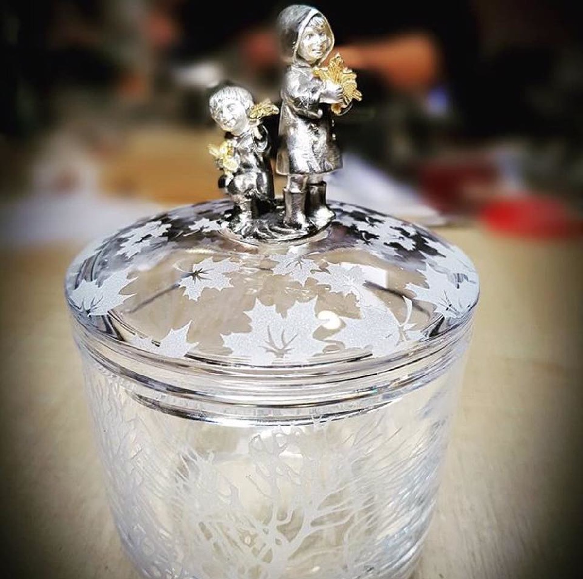 Вазочка для варенья "Осенняя прогулка" выполнена из хрусталя и украшена серебряной скульптурой на крышке изделия. Костромские ювелиры специализируются на создании уникальных подарков из серебра по собственным эскизам, изображая предметы быта или сцены из крестьянской жизни.