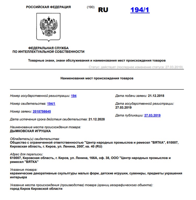 опубликовано свидетельство за номером 194/1 на НМПТ "ДЫМКОВСКАЯ ИГРУШКА" - правообладатель предприятие ООО "Центр народных промыслов и ремесел "ВЯТКА".