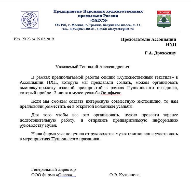 Приглашение от предприятия народных художественных промыслов России "ОЛЕСЯ"