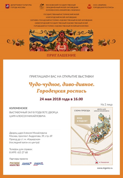 Городецкая роспись стоит в ряду самых высоких достижений народного искусства России, уникальное явление в истории народной культуры нашей страны. Самобытность этого промысла основана на удивительном синтезе древних традиций, связанных с иконописью, лубком и радостном, праздничном отражении окружающей действительности. На днях России во Франции в 2010 году Президент Франции Николя Саркози, восхитившись уникальной росписью изделий городецких мастеров сказал: «… такие произведения должны находиться в Лувре…». За более чем полутора вековую историю, Городецкая роспись, хорошо известная и любимая многими, более 30 раз выставлявшаяся за рубежом (Франция, Чехия, Германия, Швеция, Норвегия, Канада, Голландия, Италия, Бельгия, Япония, Англия, Китай и другие страны), ни разу не имела персональной выставки в Москве. Хотя замечательные коллекции Городецкого искусства хранятся в ведущих музеях России, в том числе Государственном историческом музее, Русском музее в Санкт-Петербурге и др. Наш проект призван исправить эту историческую несправедливость. Впервые на одной площадке представлено около 500 уникальных экспонатов. Самый ранний из них относится к XVIII веку. Вся история промысла, от истоков до настоящего времени предстанет перед гостями выставки. Среди сюжетов – всадники и нарядные дамы с непременными зонтиками в руках, кавалеры в военной форме и сюртуках служивых, купеческое чаепитие, исторические события того времени, сцены конных охот с собаками, соколами, роскошные кареты с лакеями на запятках и многое другое. Своеобразие этого искусства тесным образом связано с жизненным укладом, историей и культурой Нижегородского Заволжья, с его бытом, нравами, образами, что находило отражение в самом содержании росписи. Начиная с XII века, Городец входит в состав Владимиро-Суздальского княжества с ее высочайшими традициями зодчества, иконописи, декоративного искусства, в XVII-XIX в.в. – это еще и центр старообрядчества. Именно оно оказало влияние на духовную составляющую Городецких ремесел. История Городецкого княжества тесно связана с именами и подвигами Андрея Боголюбского, Александра Невского, что так же отразилось в искусстве городецких мастеров и художемков.