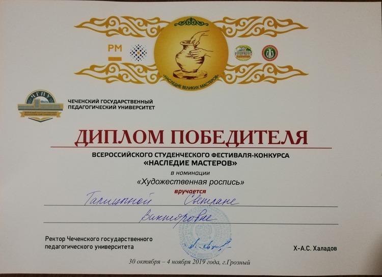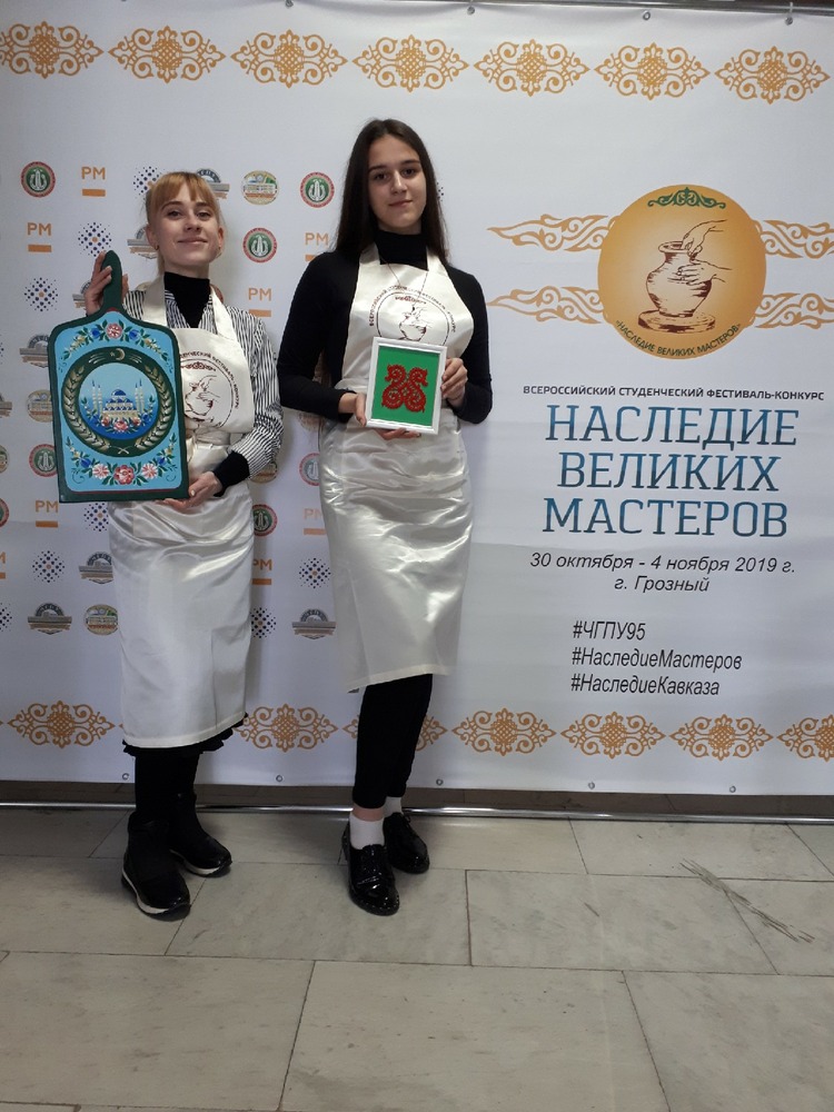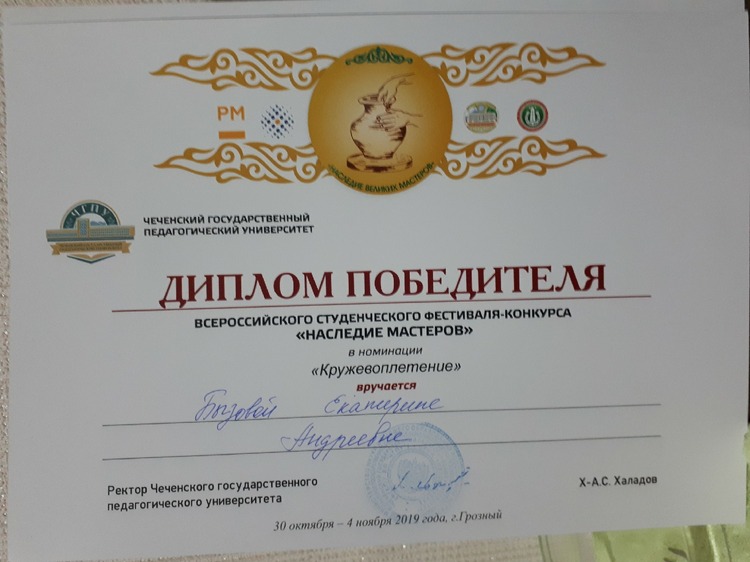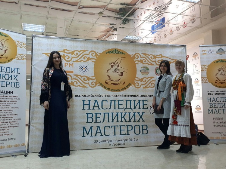 С 30 октября по 4 ноября 2019 года студентки Губернаторского колледжа народных промыслов принимали участие во Всероссийском студенческом фестивале-конкурсе «Наследие Великих мастеров» в городе Грозный, в Чеченском государственном педагогическом университете