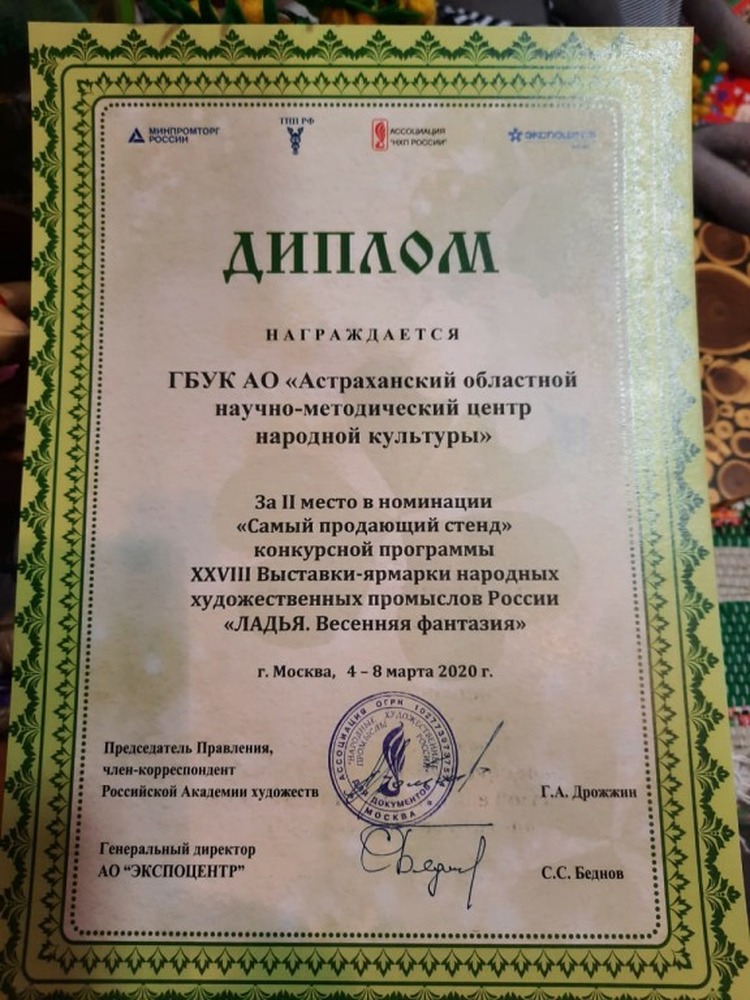 Астраханский областной научно-методический центр народной культуры награждён дипломом за второе место в номинации «Самый продающий стенд» конкурсной программы выставки-ярмарки.
