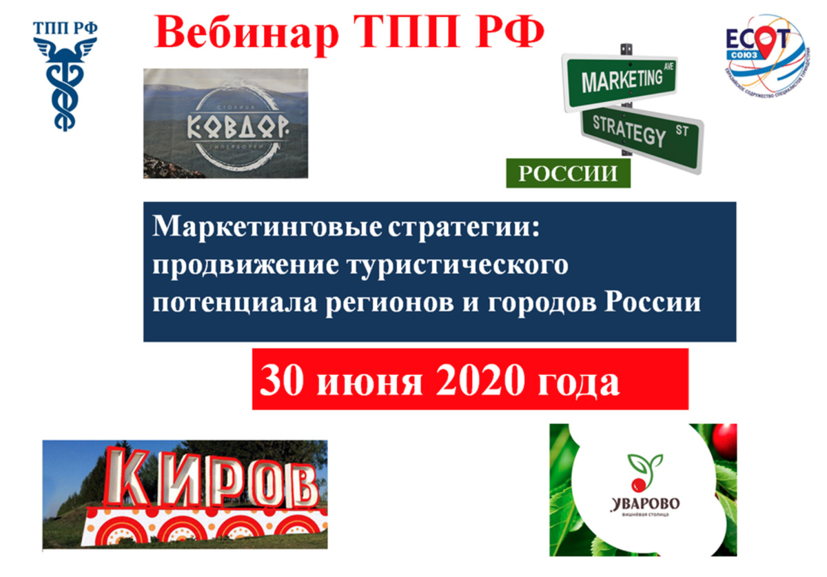 30 июня в 12:00 мск Торгово-промышленная палата Российской Федерации совместно с Союзом «Евразийское содружество специалистов туриндустрии — ЕСОТ проводит вебинар на тему: «Маркетинговые стратегии: продвижение туристического потенциала регионов и городов России» в рамках нового цикла вебинаров о брендинге.