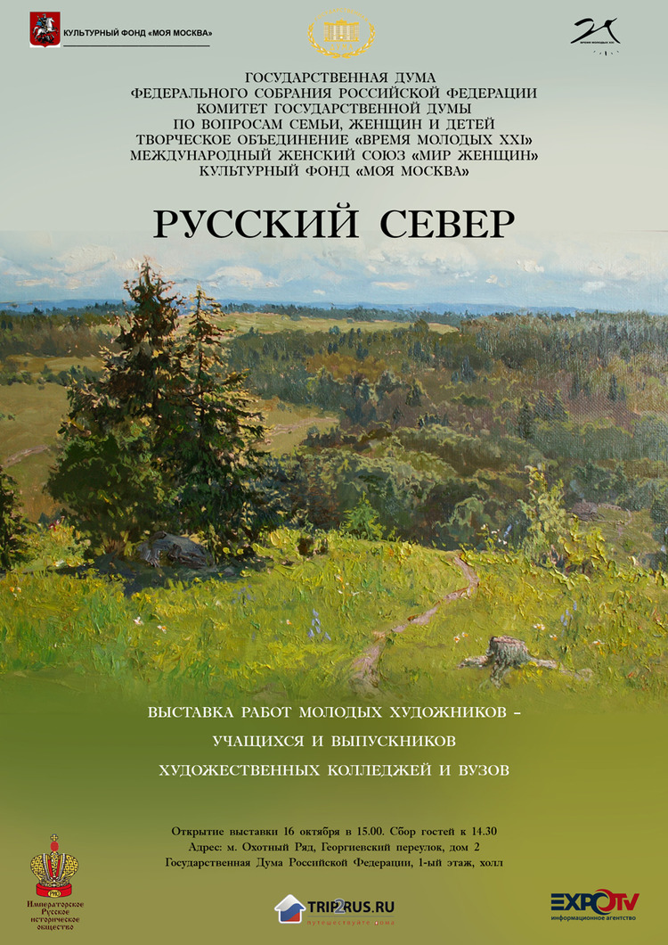 Творческое объединение «Время молодых XXI» в сотрудничестве с культурным фондом «Моя Москва» и международным союзом «Мир женщин» предложило молодым художникам – студентам и выпускникам художественных учреждений, следуя традициям старых мастеров, принять участие в выставке «Русский Север». В проекте участвуют ведущие вузы Москвы, среди них: МГАХИ им. В.И. Сурикова, МГХПА им. С.Г. Строганова, Российская академия живописи, ваяния и зодчества Ильи Глазунова и многие другие.