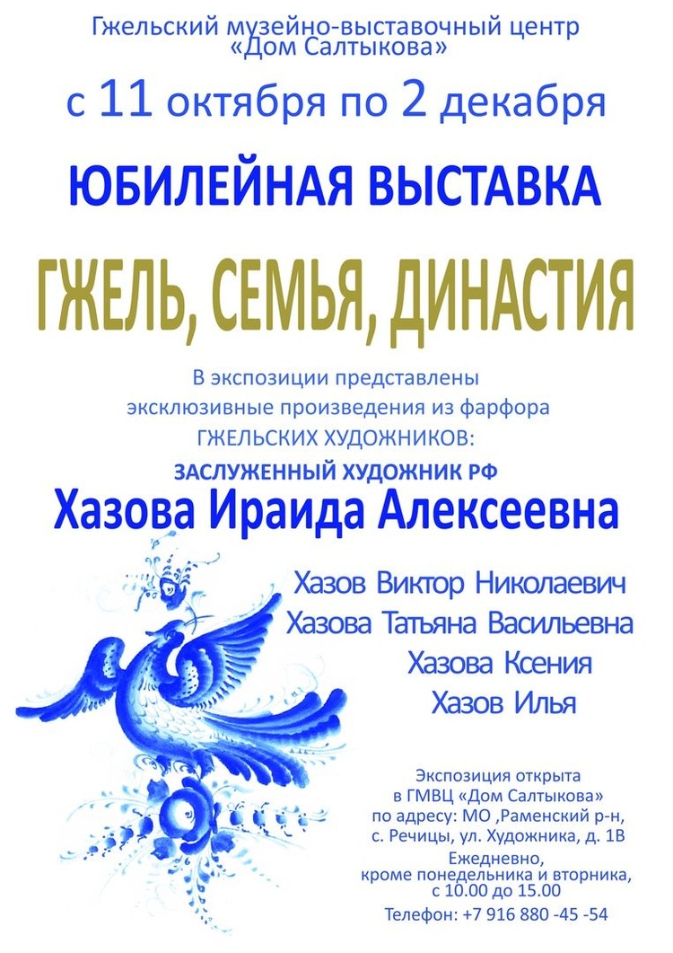 С 11 октября по 2 декабря 2018 года в Гжельском музейно-выставочном центре "Дом Салтыкова" состоится юбилейная выставка Ираиды Алексеевны Хазовой "Гжель, семья, династия".