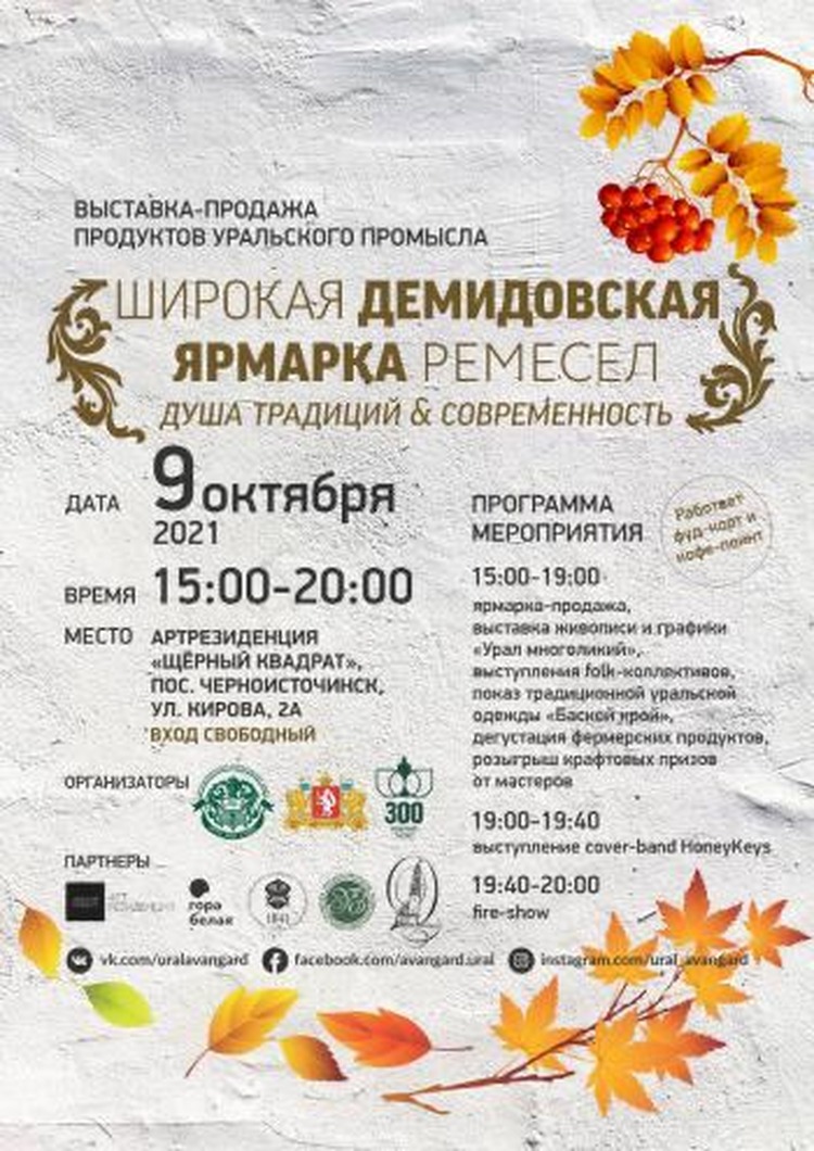 Международный Демидовский Фонд в сотрудничестве с правительством Свердловской области в рамках XI Демидовской Ассамблеи, которая пройдет 8 - 11 октября на исторических территориях присутствия династии Демидовых: Нижнем Тагиле, Невьянске и Черноисточинске, проводит масштабную Демидовскую ярмарку с выставкой-продажей продуктов уральского промысла на площадке креативного кластера АртРезиденция поселка Черноисточинск.